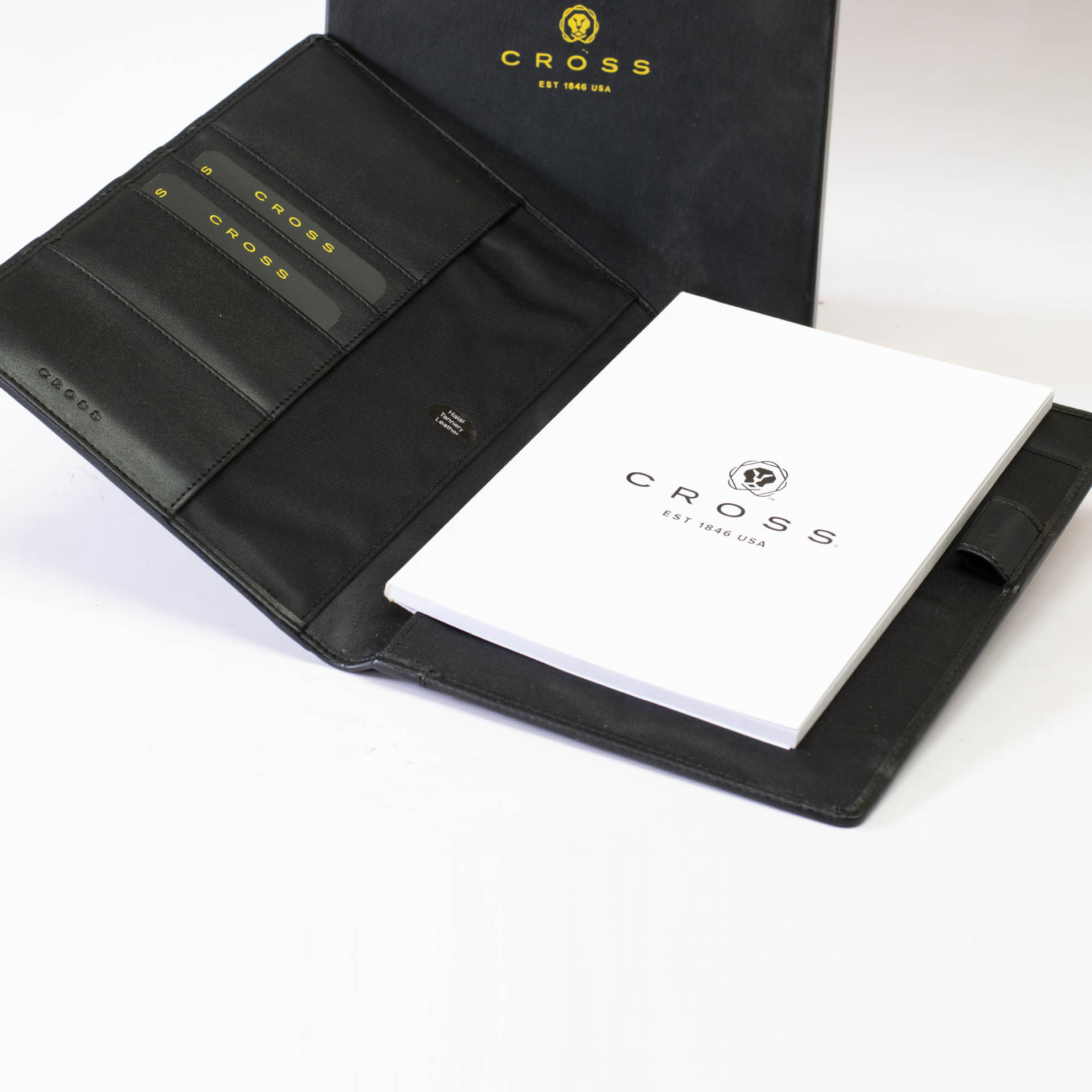 فولدر چرمی A5 کراس مشکی، ساخته شده از چرم با کیفیت در سایز کاربردی A5.